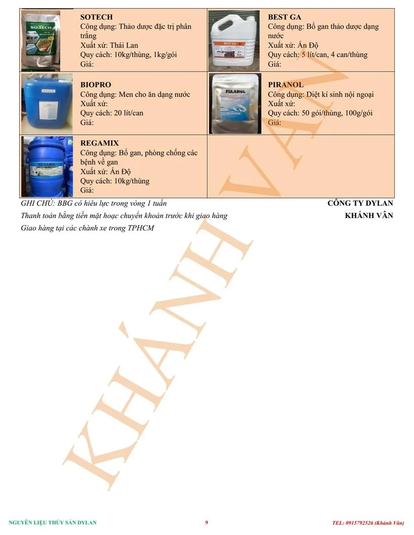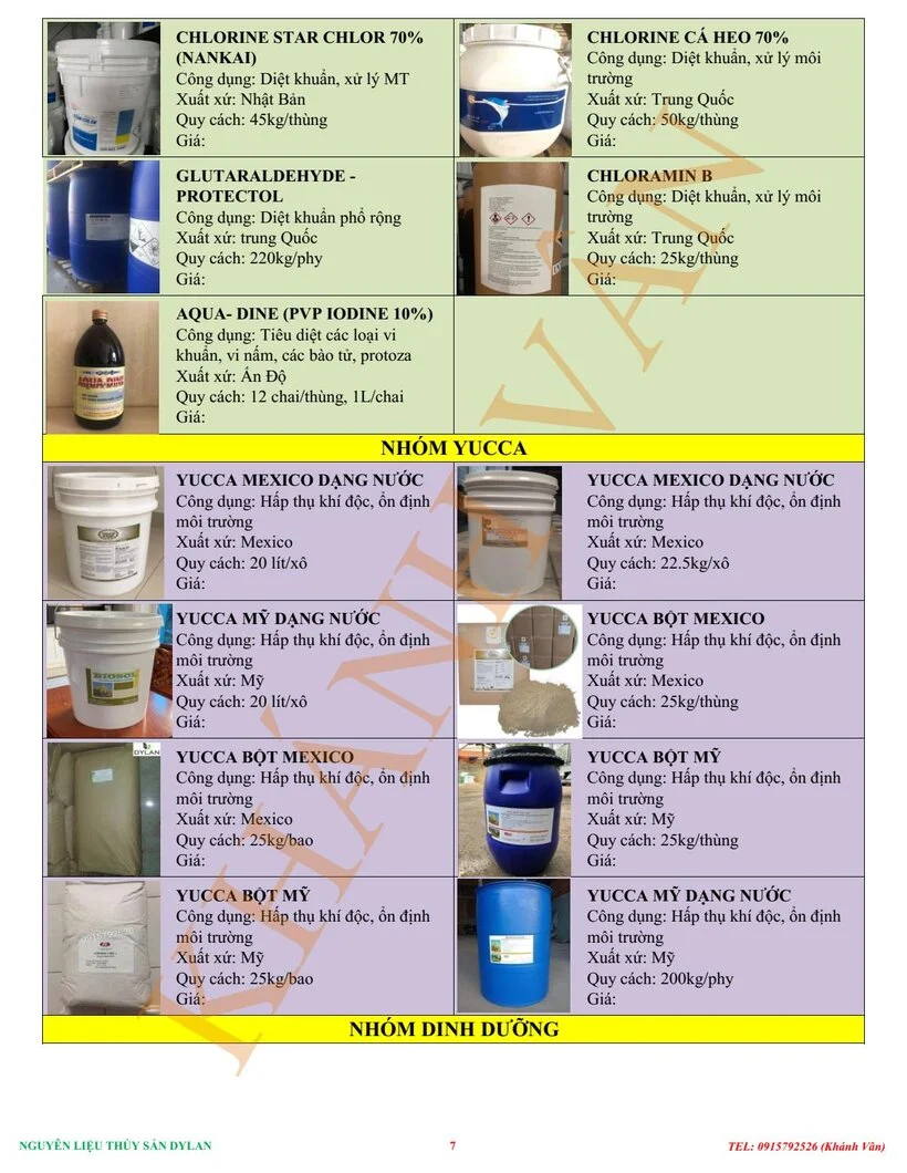 Công ty TNHH TM&DV DYLAN cung cấp đa dạng các mặt hàng nguyên liệu dùng trong Nuôi trồng Thủy sản. Chúng tôi xin gửi đến quý khách hàng danh mục nguyên liệu của công ty. Kính chúc quý khách hàng luôn có những vụ mùa bội thu!