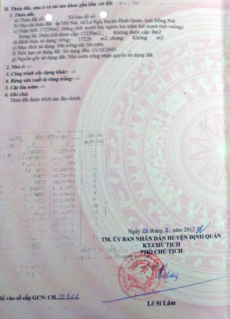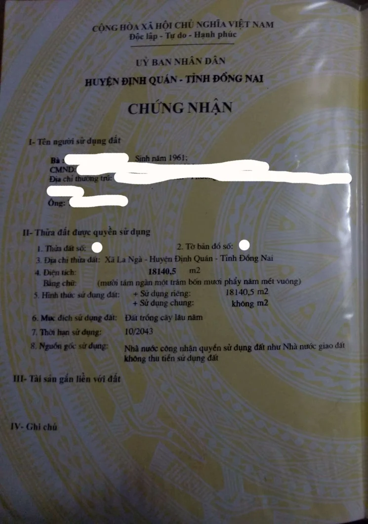 Diện tích hơn 3.5 mẫu. Tại xã La Ngà, Định Quán, Đồng Nai (gần hồ Trị An, cây xăng 96). Sổ đỏ đầy đủ.