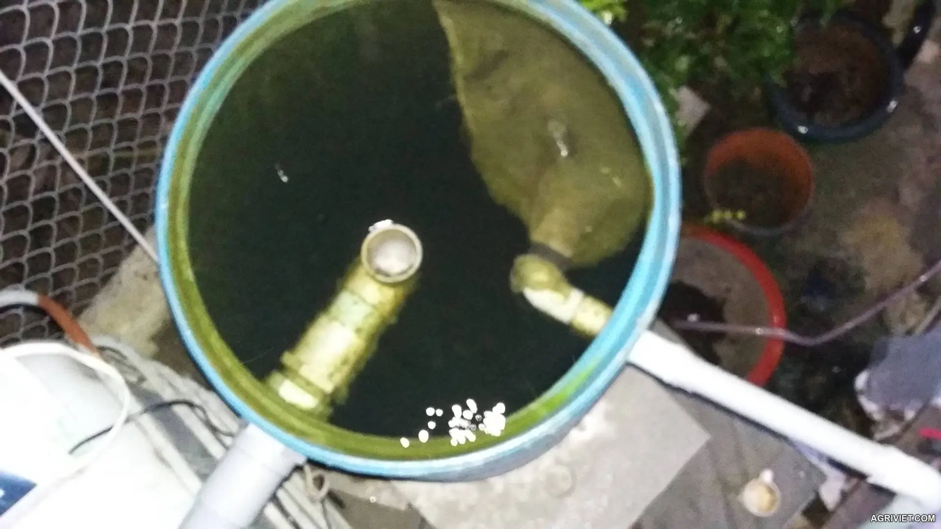 Bể cá => máy bơm hút nước vào bể vi sinh là cái bể vuông màu trắng (có xục khí và đệm vi sinh lơ lửng) => bể lắng (bể nhựa tròn màu xanh?) => từ bể lắng có bơm chìm về bể cá hay là tự chảy?
