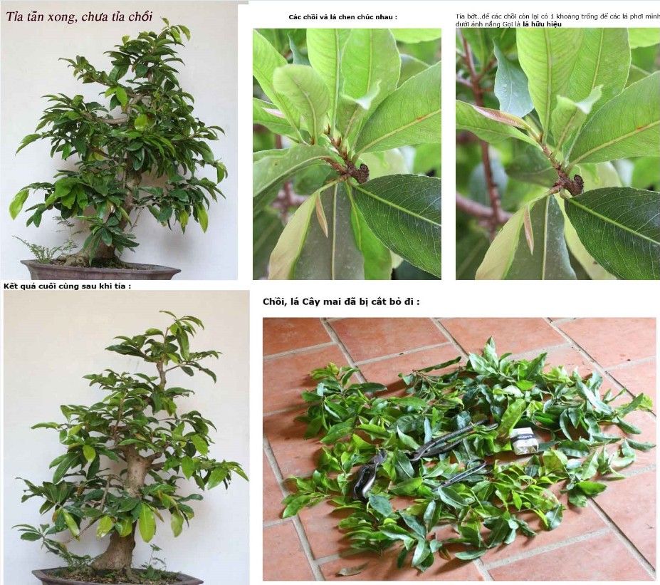 thường thì vào tháng 4 al …cứ mỗi 1 cành người cắt bỏ độ dài để và chỉ lại 4 đến 6 cái lá trong cùng… để tạo cho mai thành 1 hình khối nhỏ lại cân đối với chậu .
