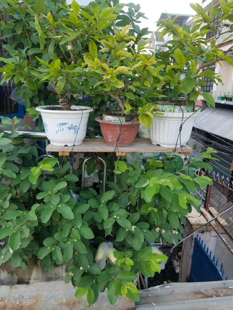 Phía dưới mấy chậu là mái tôn nhà hàng xóm, khổ nỗi đang kêu bán hông biết mấy chậu mai dè đâu