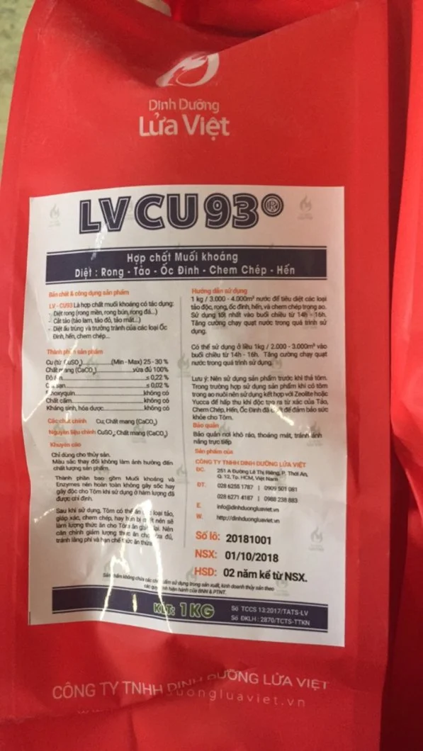 Bên mình cung cấp sản phẩm LV CU93 chuyên trị ốc đinh ao nuôi tôm...Hàm lượng sử dụng 1 kg cho 1000m3 - 2000m3 giá 501.000/ gói 1 kg
