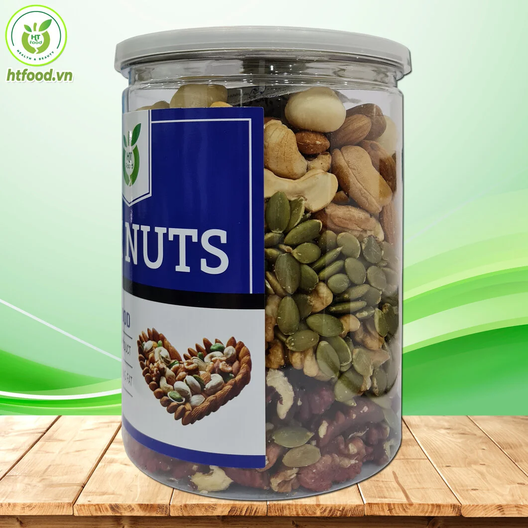 Hộp mix gồm: Nhân óc chó Đỏ, Nhân óc chó Vàng, Hạt macca tách vỏ, Hạt hạnh nhân, Hạt điều, Hạt bí xanh tách vỏ