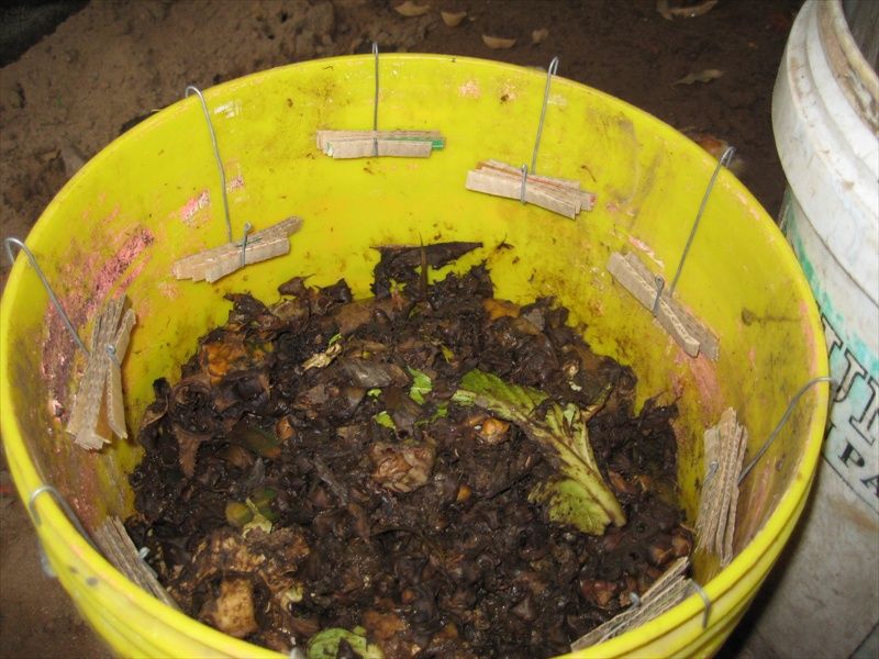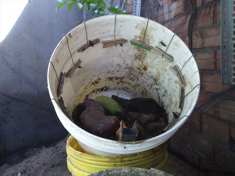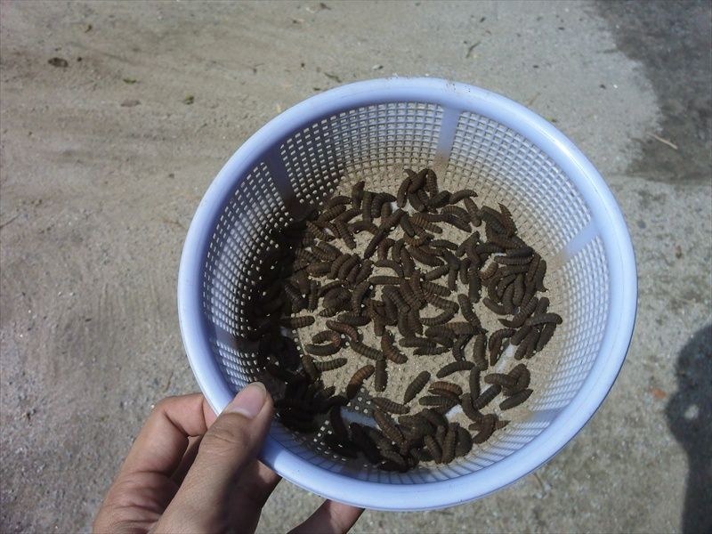 Thức ăn là phân bò tươi và hỗn hợp hèm-xác mì. Mỗi ngày cho vào khoảng 15.000 con giống (ấp từ 30 ổ trứng trong 7 ngày). Từ vài ngày nay đã bắt đầu cho thu hoạch khoảng 500-600g/ngày. Nhộng đen thu được có kích thước nhỏ, có lẽ do thùng nuôi còn trong quá trình ổn định và mình cũng cho tụi nó ăn chưa đủ. Mỗi ngày mình hớt bớt lớp dư chất trên cùng để lọc đem bón rau, và giúp giữ cho lớp dư chất trong thùng không dày lên quá nhanh, chỉ ở mức trên dưới 20cm.