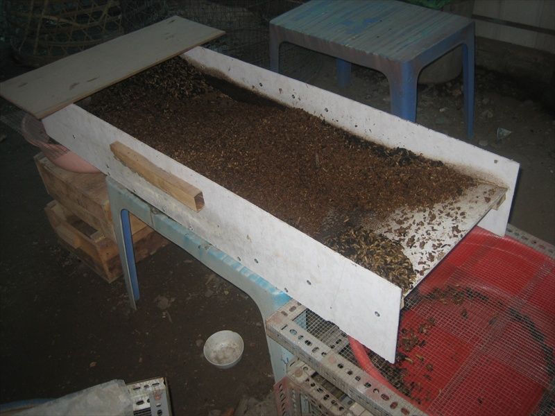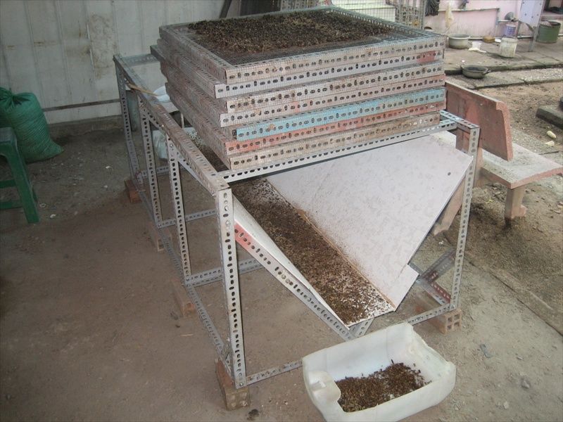 Thức ăn là phân bò tươi và hỗn hợp hèm-xác mì. Mỗi ngày cho vào khoảng 15.000 con giống (ấp từ 30 ổ trứng trong 7 ngày). Từ vài ngày nay đã bắt đầu cho thu hoạch khoảng 500-600g/ngày. Nhộng đen thu được có kích thước nhỏ, có lẽ do thùng nuôi còn trong quá trình ổn định và mình cũng cho tụi nó ăn chưa đủ. Mỗi ngày mình hớt bớt lớp dư chất trên cùng để lọc đem bón rau, và giúp giữ cho lớp dư chất trong thùng không dày lên quá nhanh, chỉ ở mức trên dưới 20cm.