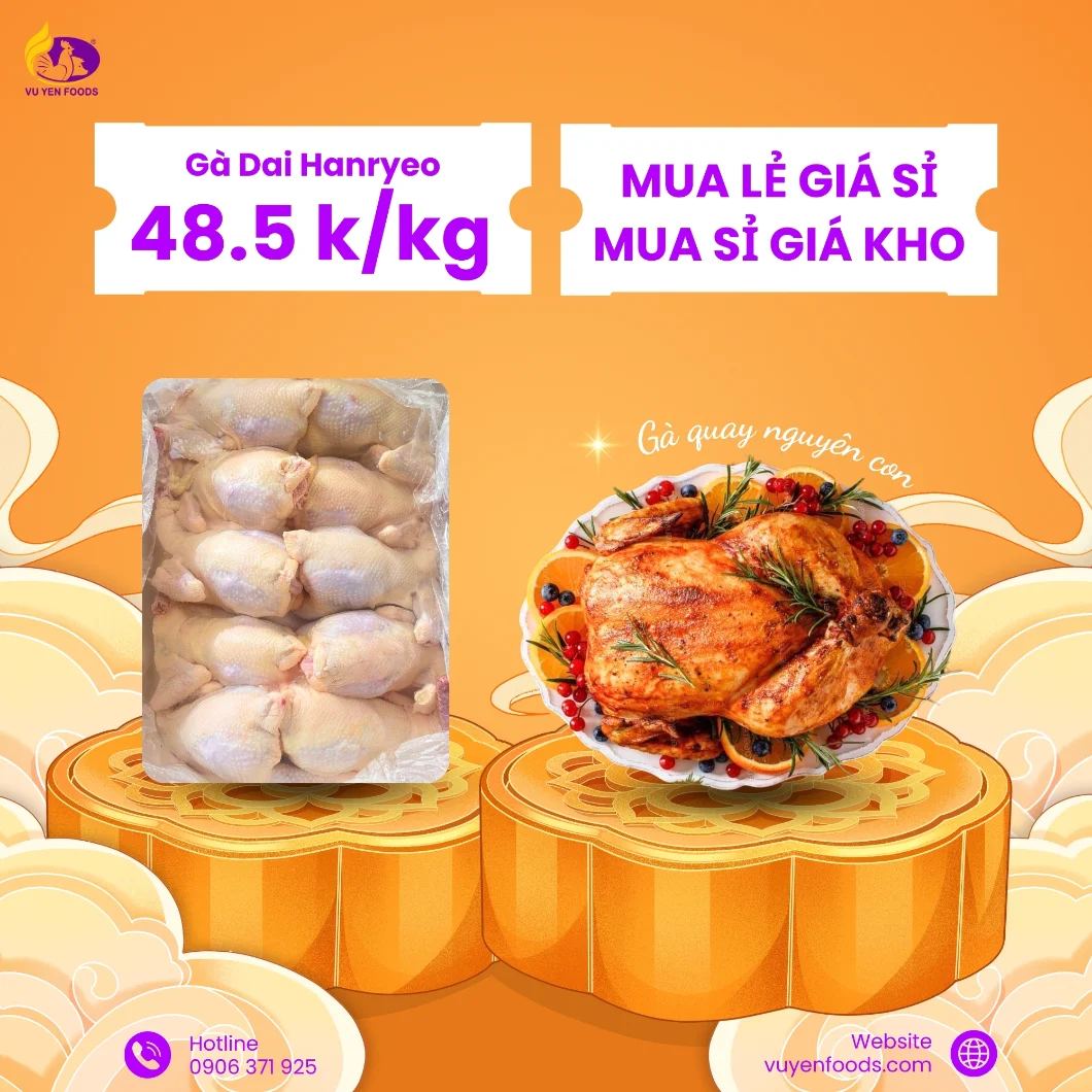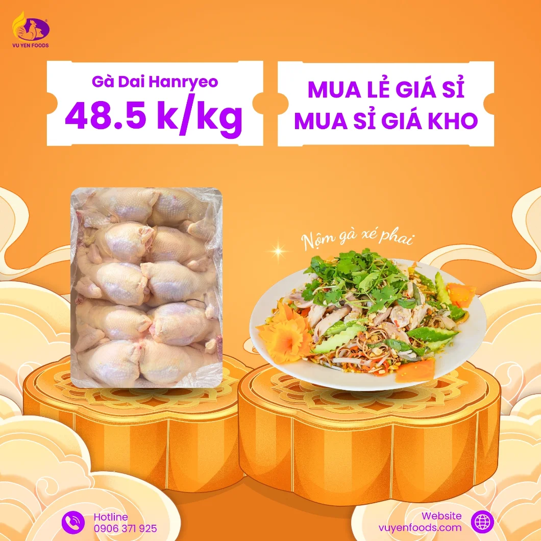3.1. Nộm Gà Xé Phay – từ Gà Dai Hàn Quốc Hanryeo Món nộm gà xé phay với vị chua, cay, mặn, ngọt hài hòa là một món khai vị thanh mát lý tưởng cho bữa tiệc Trung thu nhiều món béo. Nước mắm, đường, chanh và một chút ớt tạo nên một hương vị hấp dẫn, kích thích vị giác. Sản phẩm Gà dai Hanryeo nhập khẩu từ Hàn Quốc là lựa chọn hoàn hảo cho món ăn này. Loại gà này có đặc điểm thịt dai, chắc, không bị bở như gà công nghiệp, rất phù hợp để làm nộm hoặc chế biến các món chiên, xào, nướng. Gà Hanryeo còn chứa hàm lượng protein cao và các axit amin tốt cho tim mạch, mang đến giá trị dinh dưỡng vượt trội.