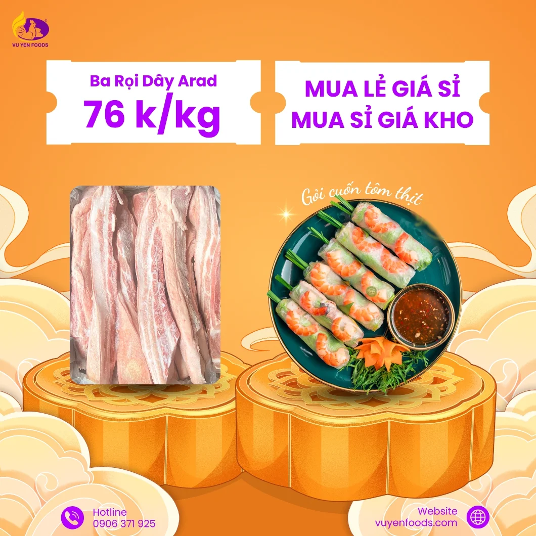 3.2. Gỏi Cuốn Tôm Thịt – từ Ba Rọi Dây AradTuy không phải là món ăn truyền thống của mâm cỗ Trung thu , gỏi cuốn tôm thịt lại là một sự bổ sung sáng tạo, mang đến sự tươi mới và nhẹ nhàng. Món ăn này đặc biệt phù hợp với không khí trò chuyện, quây quần bên nhau. Ba rọi dây Arad từ Vũ Yến Foods có trọng lượng 14kg/thùng, là một lựa chọn chất lượng cho món gỏi cuốn này. Lớp thịt và mỡ dính chặt vào nhau, khi luộc chín, thái mỏng và cuốn cùng tôm, rau sống sẽ tạo nên hương vị béo ngậy mà không ngấy.