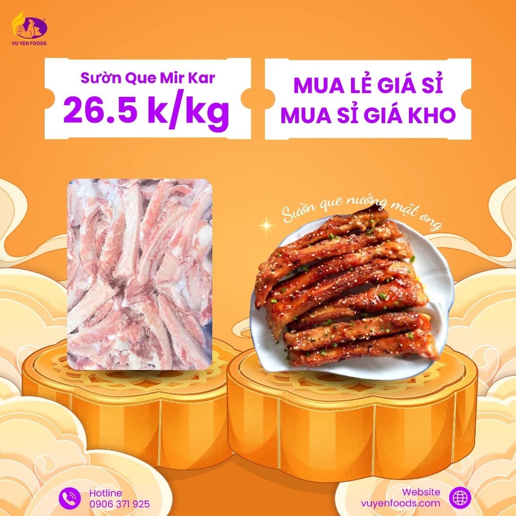 3.3. Sườn Que Nướng Mật Ong – từ Sườn Que Mir KarSườn que nướng mật ong là một món chính đầy lôi cuốn, có thể trở thành điểm nhấn của mâm cỗ. Hương vị đậm đà từ gia vị ướp và vị ngọt thanh của mật ong hòa quyện vào từng thớ thịt mềm ngọt, tạo nên sức hấp dẫn khó cưỡng. Sản phẩm sườn que đông lạnh của Vũ Yến Foods được chọn lọc từ những thanh sườn có lớp thịt tương đối dày bao quanh, màu hồng nhạt, đảm bảo chất lượng khi nướng. Việc sử dụng sườn que đông lạnh còn mang lại lợi thế về giá thành. Món ăn này có thể chế biến đơn giản bằng cách ướp sườn với hành, tỏi, mật ong, ngũ vị hương và nướng trên bếp than truyền thống hoặc nồi chiên không dầu hiện đại.