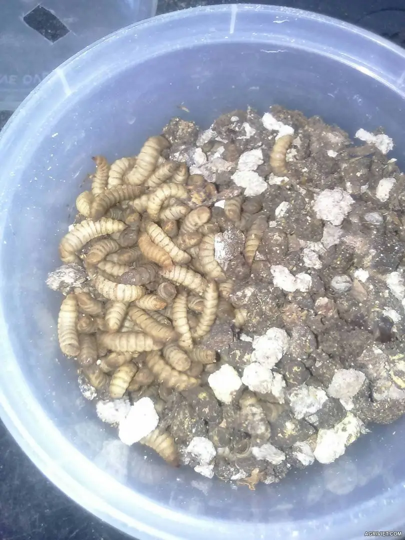 - Số liệu nuôi hiện tại: 4kg hèm + 4kg xác mì +1kg nước+ khoảng 3000 con giống, sau 14 ngày cho ra 500-650g ấu trùng tươi sống.