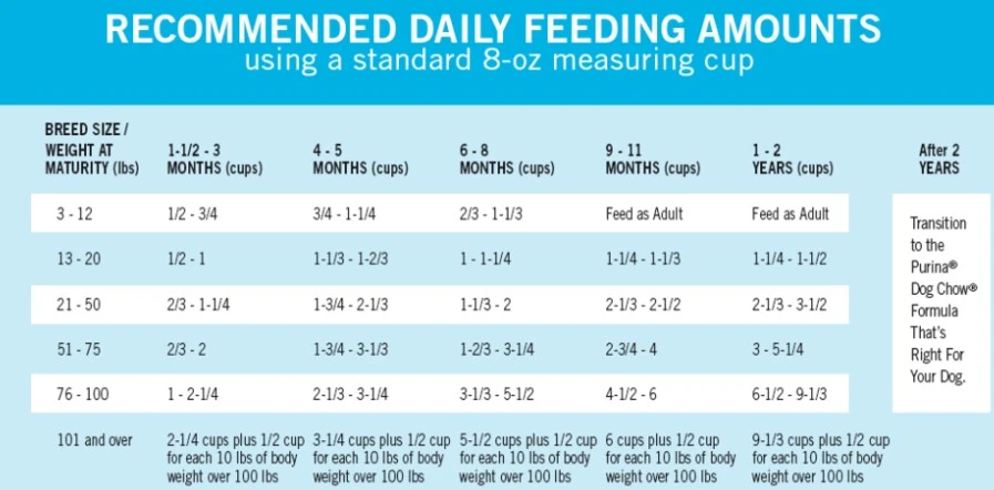 Các cột cho biết lượng thức ăn nuôi chó 1 ngày trong từng cột, mỗi cột là tuổi chó tính ra tháng. Cột cuối cùng là chó đã 1-2 năm tuổi.
