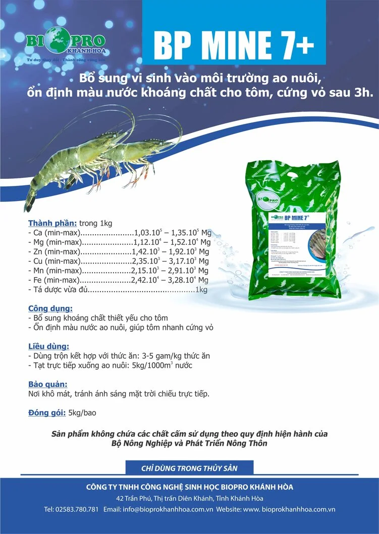 - BP K+ - Bổ sng đầy đủ khoáng chất thiết yếu cho tôm. Giúp tôm cứng vỏ sau 3 giờ.
