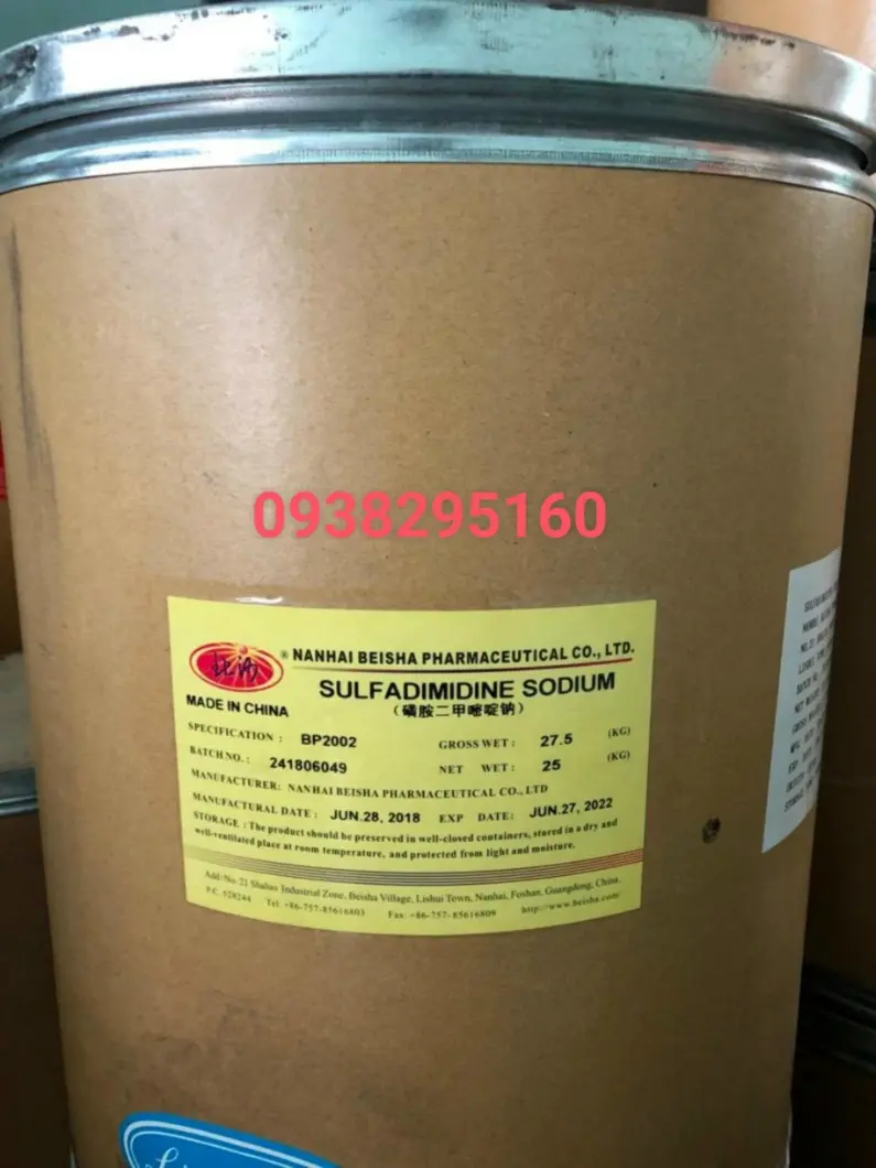 SULFADIMIDINE SODIUM Xuất xứ: Trung Quốc Quy cách: 25kg/thùng Công dụng: trị các bệnh nhiễm khuẩn do Aeromonas sp.,Pseudomonas sp. (đốm đỏ, hậu môn sưng đỏ, xuất huyết, lở loét ) Liên hệ: 0938295160