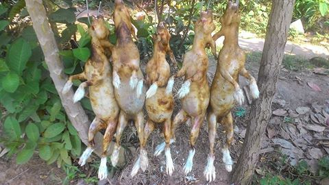 Thỏ làm sạch, bỏ nội tạng, khè vàng. Thỏ lột da
