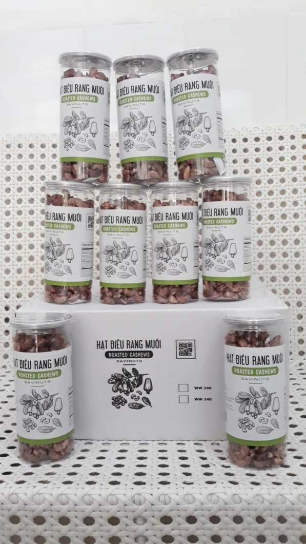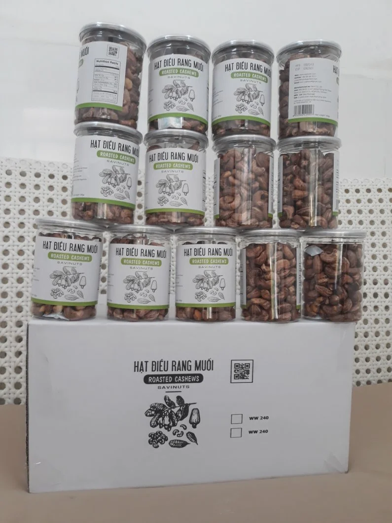Sản phẩm : hạt điều rang muối vỏ lụa - đóng hộp Pet 300gr (40 hộp/thùng) và 500gr (20 hộp/thùng)