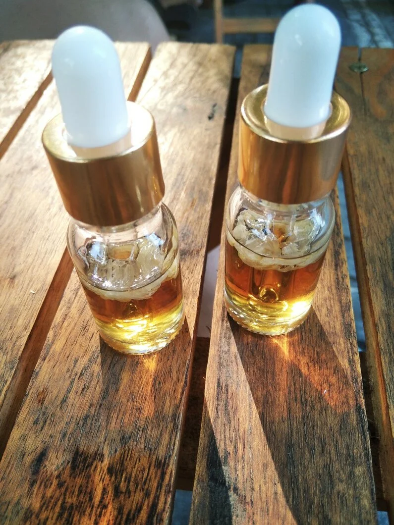 Lọ tinh dầu có 10 bọng tinh dầu còn nguyên bọng, được giữ và bảo quản trong nước mắm cốt thơm ngon.